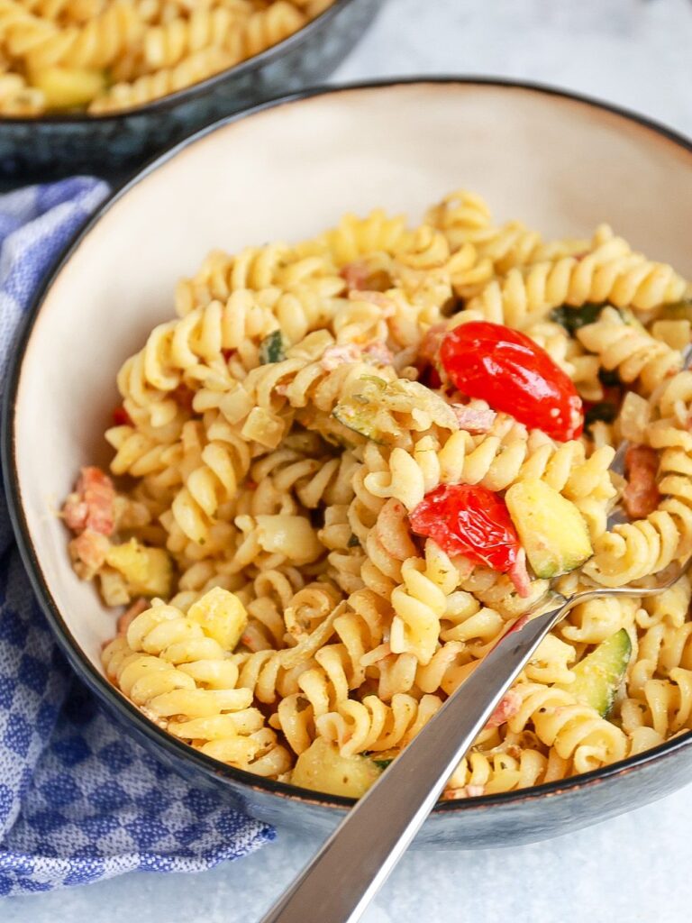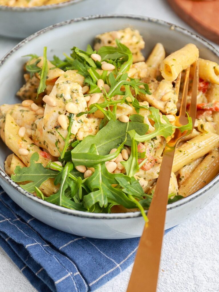Serveer de pasta kip-pesto met rucola en eventueel wat geraspte Parmezaanse kaas. Ook super lekker met geroosterde pijnboompitten.
