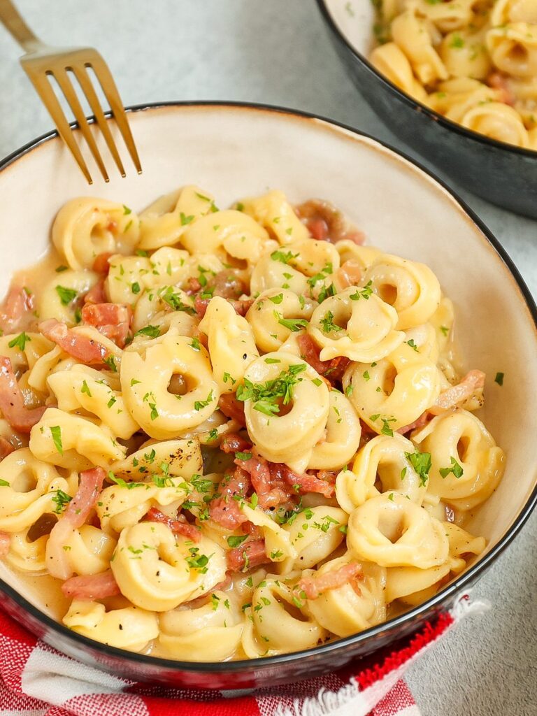 Serveer de pasta met courgette en spekjes eventueel met wat parmezaanse kaas, rucola en/of pijnboompitjes.