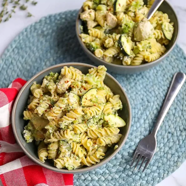 Kook de pasta volgens de bereidingswijze op het pak. Kook de broccoliroosjes ongeveer 10 minuten. Snijd de ui, kipfilet en courgette in stukjes. Breng de kipfilet op smaak met zout en peper. Eventueel kun je de kip op smaak brengen met kipkruiden. Giet een scheutje olie in een pan en bak de kip rondom bruin. Voeg daarna de ui, courgette en knoflook toe.