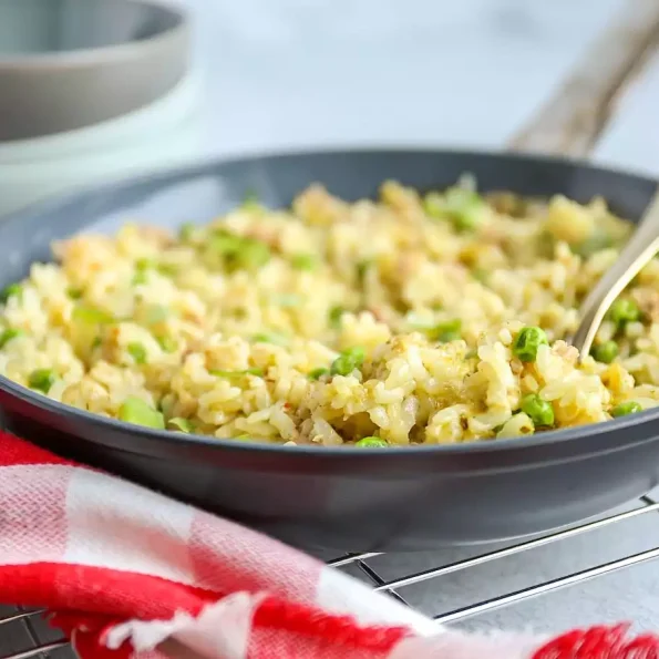 Zet de risotto 30 minuten in de oven. Na 25 minuten haal je de risotto even uit de pan, voeg je de tuinerwten toe. Zet de ovenschaal terug in de oven voor 5 minuten.