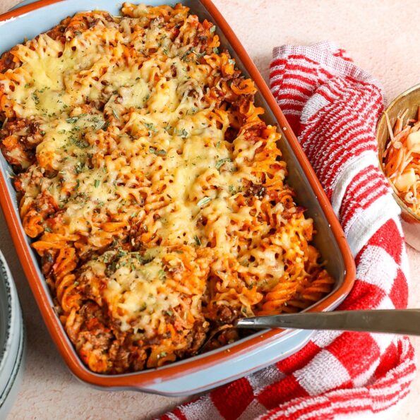 Als je een ovenbestendige pan gebruikt, kun je de geraspte kaas er overheen strooien en de pan zo de oven inschuiven. Zo niet, schep alles in een ovenschaal en strooi dan de geraspte kaas er overheen.