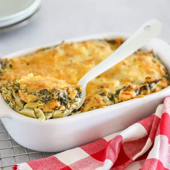 Voeg daarna beetje voor beetje de spinazie toe. Als de spinazie geslonken is, voeg je weer een nieuwe hand met spinazie toe. Als alle spinazie geslonken is, kan de de crème fraiche, kruidenroomkaas, snufje zout en peper en dille erbij. Laat dit een paar minuten pruttelen en zet dan het vuur uit. Vet een ovenschaal in. Bedek de bodem met lasagnebladen. Daarna een laag saus, een laag lasagnebladen enz. Eindig met een laag saus. Waarschijnlijk hou je wat lasagnebladen over. Strooi over de ovenschotel wat geraspte kaas.